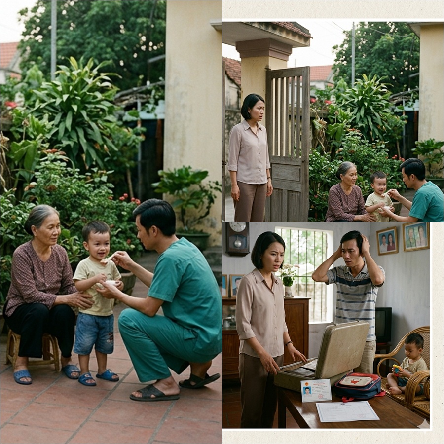 Không khí nặng nề đến nghẹt thở. Mẹ chồng ôm chặt đứa bé, ba chồng đứng chết lặng ngoài hiên, còn chồng tôi thì cứng họng, mồ hôi túa ra.