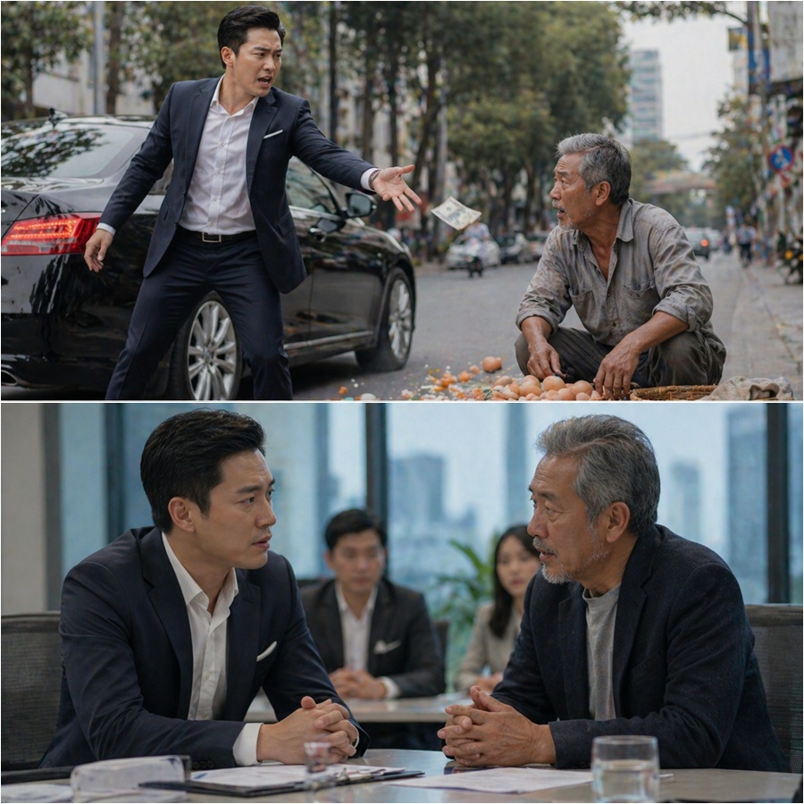 Chiếc ô tô màu đen bóng loáng rẽ gấp ở khúc cua làng, tiếng phanh “két” chói tai vang lên, rồi rầm! — một chiếc xe máy cà tàng chở hai sọt trứng lớn đổ nhào ra đường. Trứng vỡ nhoe nhoét, vàng trắng loang lổ giữa nắng trưa.ac