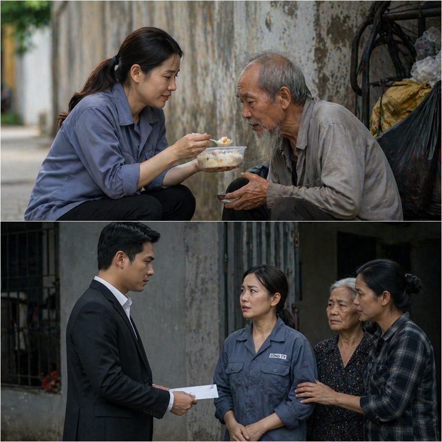 Thế rồi biến cố ập đến. Công ty xây dựng nơi chị làm ăn thua lỗ, nợ chồng chất, giải thể đột ngột.Lương tháng cuối bị nợ lại, chị tay trắng, thất nghiệp. Không chồng, không con, không bằng cấp, chị dọn về xóm trọ nghèo ở ngoại ô, sống bằng tiền tích cóp cũ và những bữa mì gói lặng lẽ.Hàng xóm dần biết chuyện, người thương thì cho rau, kẻ quen thì giới thiệu việc rửa chén theo giờ. Chị gật đầu hết, miễn có đồng ra đồng vào. Nhưng mỗi chiều, đi ngang mấy công trình, lòng chị lại chùng xuống, nhớ những ngày đổ mồ hôi mà vẫn thấy ấm lòng, vì ít nhất khi đó chị còn được trao đi.Một chiều muộn, trời mưa lất phất, có tiếng gõ cửa phòng trọ ọp ẹp. Chị Hương mở cửa, thấy một người đàn ông trẻ, ăn mặc gọn gàng, tay cầm túi giấy và một phong bì.“Chị có phải là người từng làm công nhân xây dựng ở công trình đường vành đai không ạ?”Chị ngẩn người, gật đầu: “Dạ, đúng rồi. Nhưng… sao cậu biết?”Người đàn ông cúi đầu, nói chậm rãi:“Em là con trai ông cụ nhặt ve chai chị vẫn hay để cơm và nước cho. Bố em vừa mất tháng trước… Nhưng trước khi mất, ông nhắc chị rất nhiều lần. Ông bảo, hồi ấy sống được là nhờ những hộp cơm ấy. Ông bảo chị tốt bụng, sống tử tế, và ước gì có ngày được báo đáp.”Chị Hương sững người, cổ họng nghẹn lại.