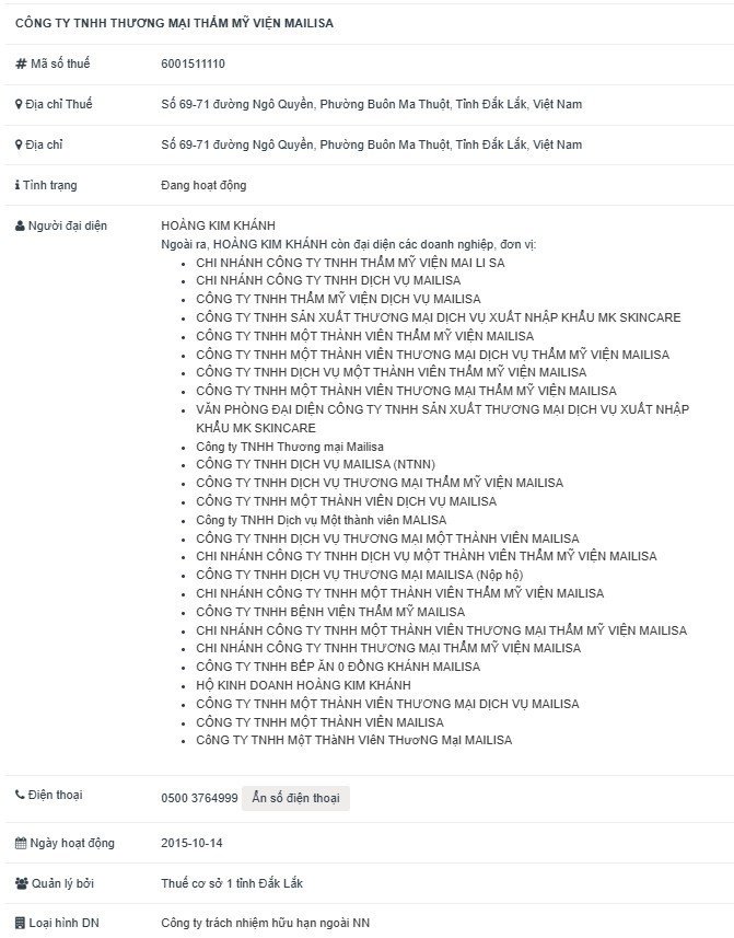 Trước đó, chia sẻ trên trang facebook cá nhân, ông Hoàng Kim Khánh – chồng bà Phan Thị Mai, chủ chuỗi thẩm mỹ Mailisa – cho biết, Công ty TNHH Thương mại thẩm mỹ viện Mailisa (Đắk Lắk) ra đời từ năm 2015 tại địa chỉ 69-71 Ngô Quyền, phường Tân Lợi, TP.Buôn Ma Thuột (nay là phường Buôn Ma Thuột).