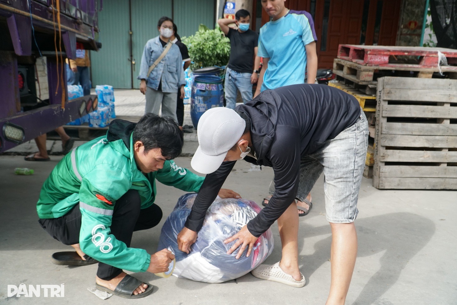 Khi biết tin địa điểm trên đường D4 cần người hỗ trợ bốc hàng, anh Nguyễn Thái Hòa (26 tuổi, quê Bình Định) tắt ứng dụng xe ôm công nghệ, gác lại công việc mưu sinh rồi đi hơn 10km từ phòng trọ ở Thủ Dầu Một xuống Dĩ An để phụ chuyển hàng lên xe.