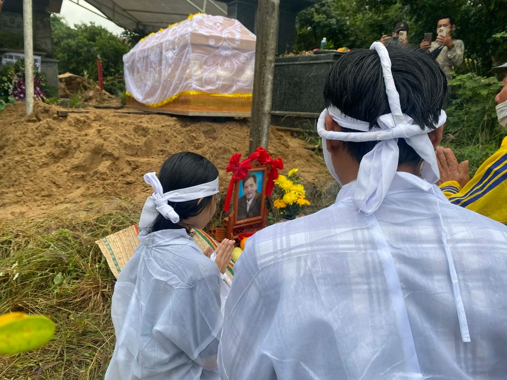 Trong tang lễ, con trai lớn của nghệ sĩ Thương Tín – ca sĩ Thanh Tùng – đội khăn tang, ôm di ảnh cha. Con gái nhỏ 12 tuổi của cố nghệ sĩ cũng có mặt, mặc đồ tang đứng cạnh anh trai.