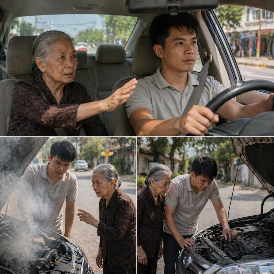 Chưa đầy 10 phút sau, khi xe chạy qua đoạn đường vắng, bà cụ nhíu mày, hít nhẹ rồi nói: