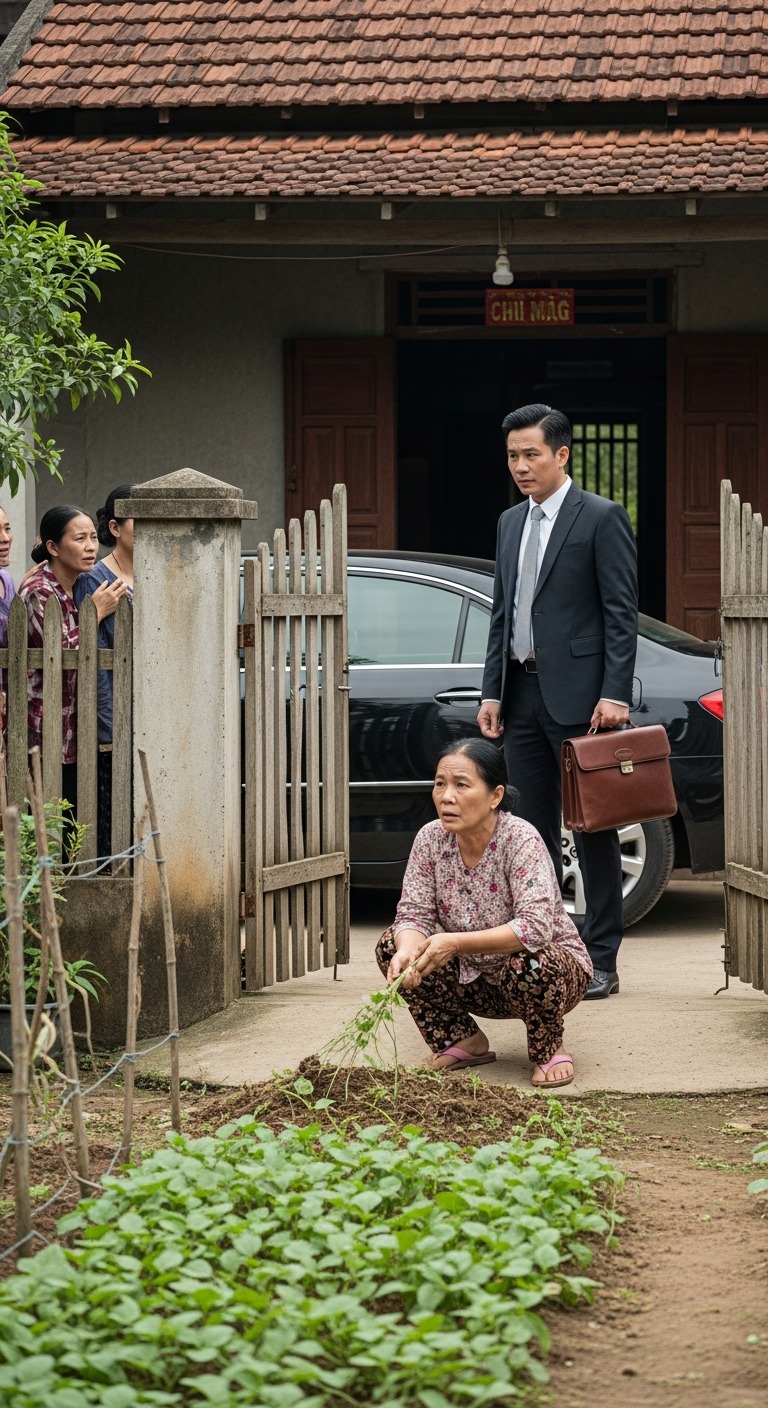 Chiều hôm ấy, trời đang nắng bỗng đổ mưa rào. Mai đang thu quần áo thì tiếng động cơ ô tô vang lên trước cổng. Cả xóm đổ ra xem — bởi trong cái làng nghèo này, hiếm có chiếc xe nào sang đến vậy.