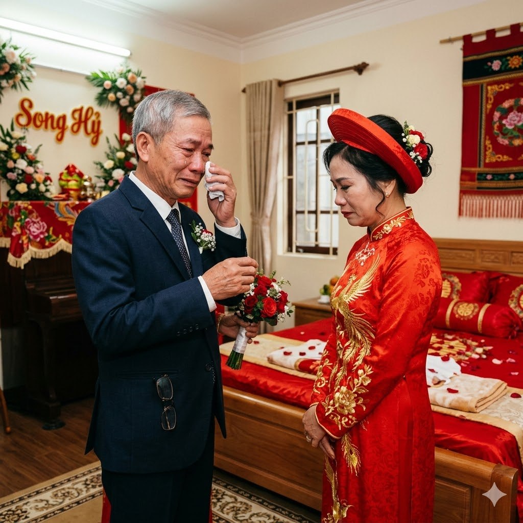 Ngày cưới, tôi mặc áo dài gấm màu nâu sẫm, cô mặc áo dài lụa trắng, tóc vấn đơn giản, cài một chiếc kẹp ngọc trai nhỏ xíu. Bạn bè, hàng xóm đến chúc mừng đông đủ. Ai cũng bảo: “Trông cô chú như hồi trẻ lại.”