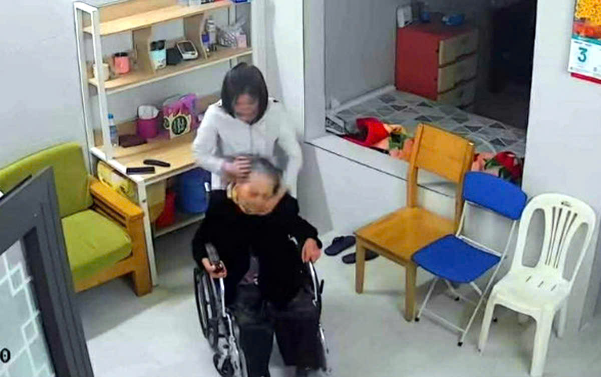 Hình ảnh nữ giúp việc bạo hành cụ bà ngồi trên xe lăn.