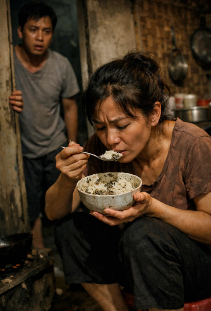 Nhưng cái mùi chua nồng của bát cơm thiu đã tố cáo tất cả. Anh bước tới, nắm lấy cổ tay tôi, kéo tôi đứng dậy. Đôi mắt anh đỏ ngầu, nhìn chăm chằm vào bát cơm dở dang dưới đất, rồi nhìn sang mâm cơm đầy đủ thịt cá vẫn còn đặt trên bàn – phần cơm mà mẹ anh vừa ăn xong nhưng tuyệt nhiên không để lại cho con dâu lấy một miếng tử tế.