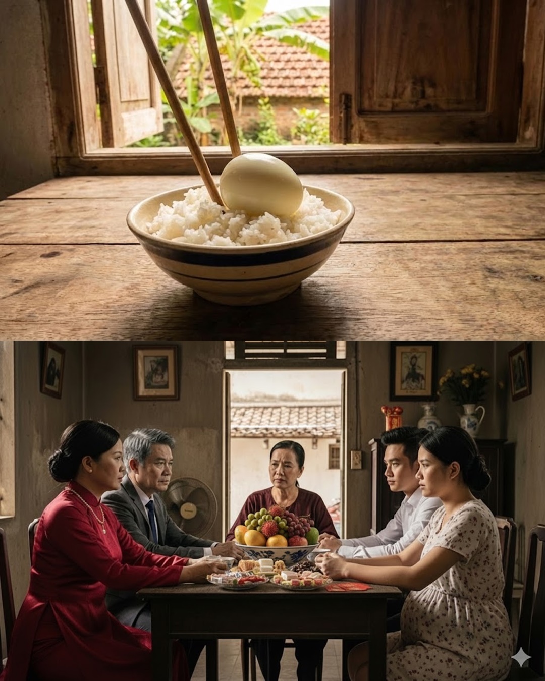 Tấm khăn đỏ được lật ra. Không khí trong phòng như đông đặc lại. Mẹ Lan chết lặng. Lan bám chặt vào mép cửa buồng, móng tay bấm sâu vào gỗ đến bật máu. Trên khay sơn son thếp vàng ấy, trơ trọi một bát cơm trắng lùm lùm và một quả trứng luộc….