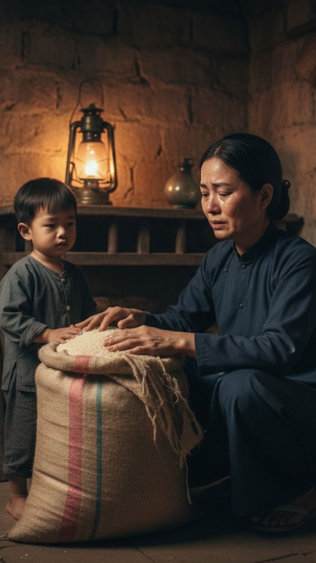 Mẹ ra đỡ, đặt túi gạo xuống, mở miệng túi. Bất ngờ, bàn tay bà khựng lại. Giữa đống gạo trắng, có một cái hộp gỗ nhỏ, cũ kỹ, kèm một túi vải buộc chặt.