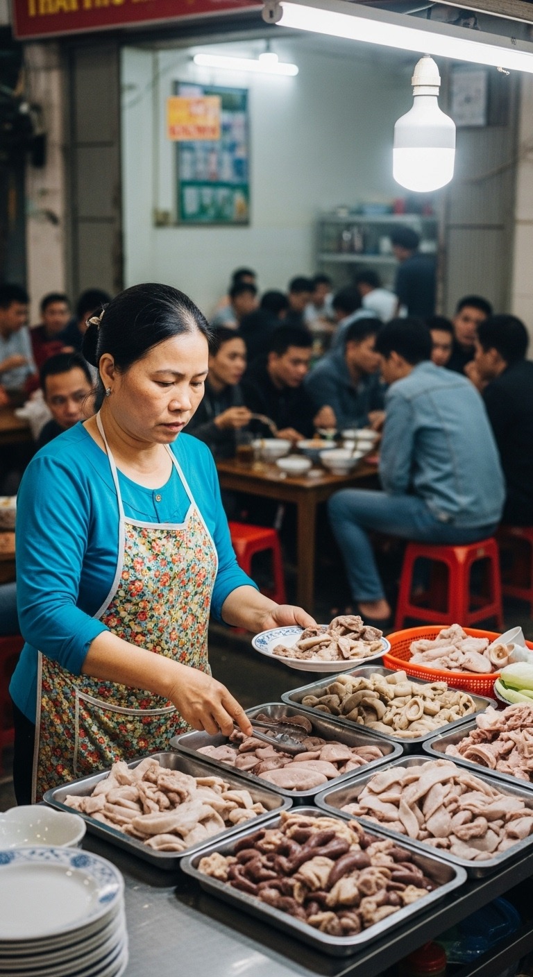 Bà Sáu chỉ cười hiền, đôi tay gầy guộc thoăn thoắt thái từng khúc lòng, đổ cháo, bưng bát — thuần thục đến khó tin.