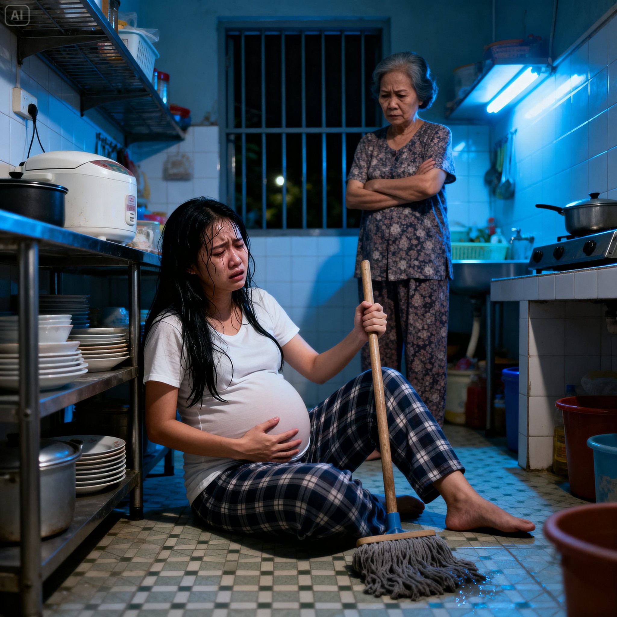 Có lần tôi mệt quá, ngồi thụp xuống bếp, ôm b/ụ/ng th/ở d/ố/c. Bà đi ngang, nhìn tôi như nhìn người ăn vạ: “Đứng dậy đi. Nhà dơ kìa.”