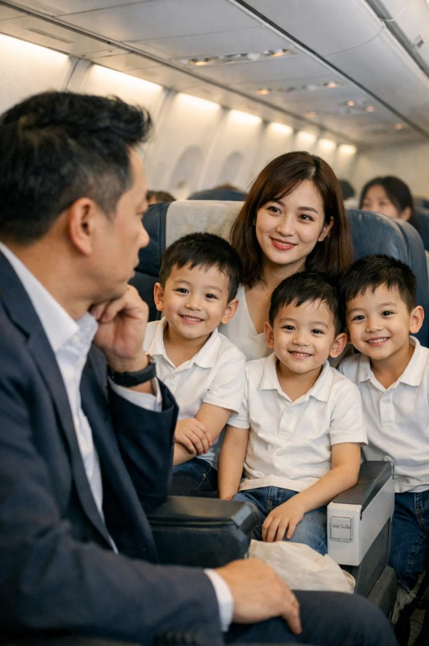 Lâm Khánh lạnh lùng nhìn về phía Mai, giọng nói trầm thấp nhưng đầy uy quyền: “Tôi muốn nói chuyện riêng với vị hành khách nữ đang ngồi ở hàng ghế phía trước, cùng với ba đứa trẻ. Ngay lập tức.”