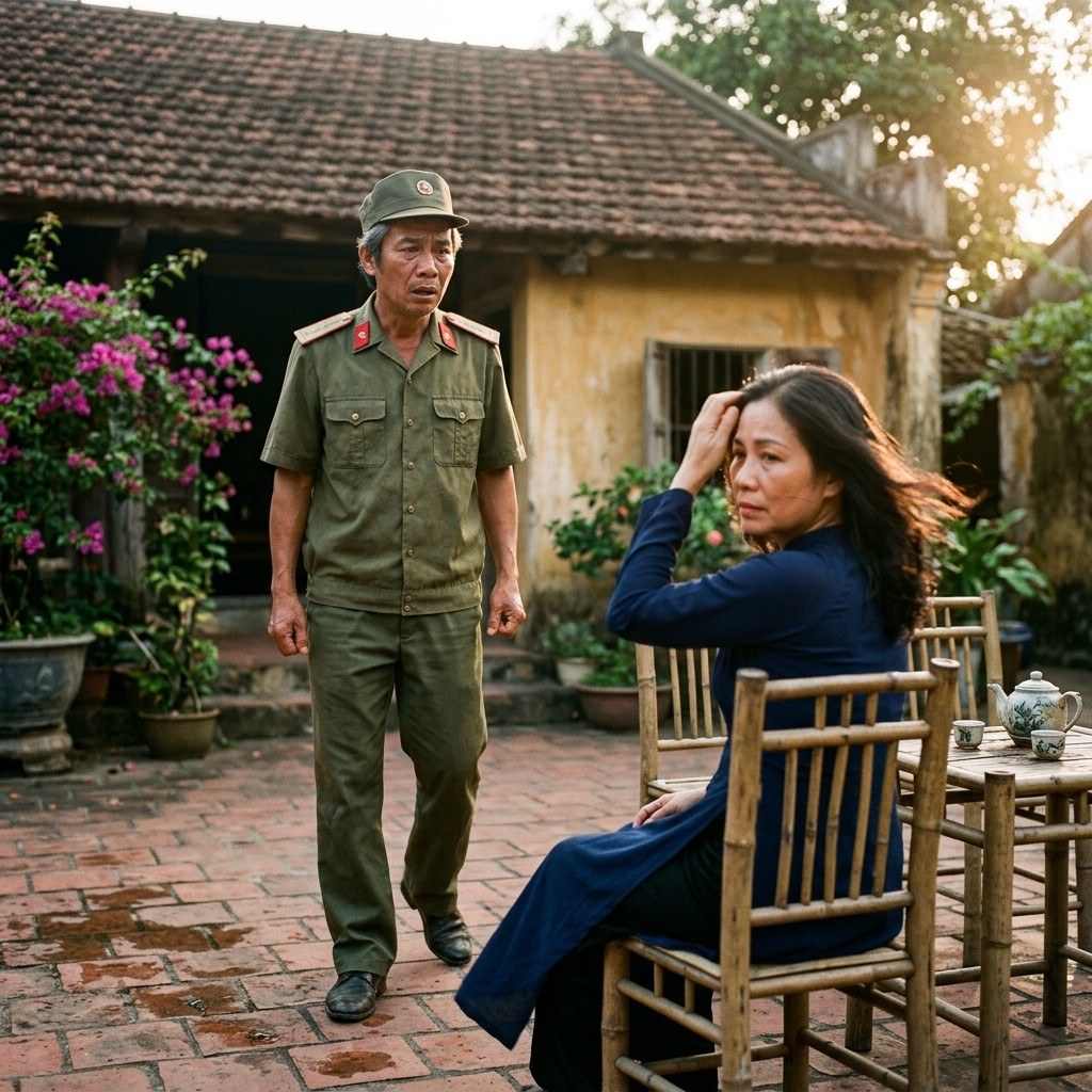 Ông ngồi xuống ghế gỗ dưới hiên. Mẹ vợ ông nắm tay ông, giọng nghẹn ngào: “Con giờ đã lên đại tá rồi à?” Ông khẽ gật đầu. Bà mỉm cười tự hào xen lẫn buồn bã: “Nếu Lan còn sống, chắc nó mừng lắm… con trai nó giỏi thế này.”