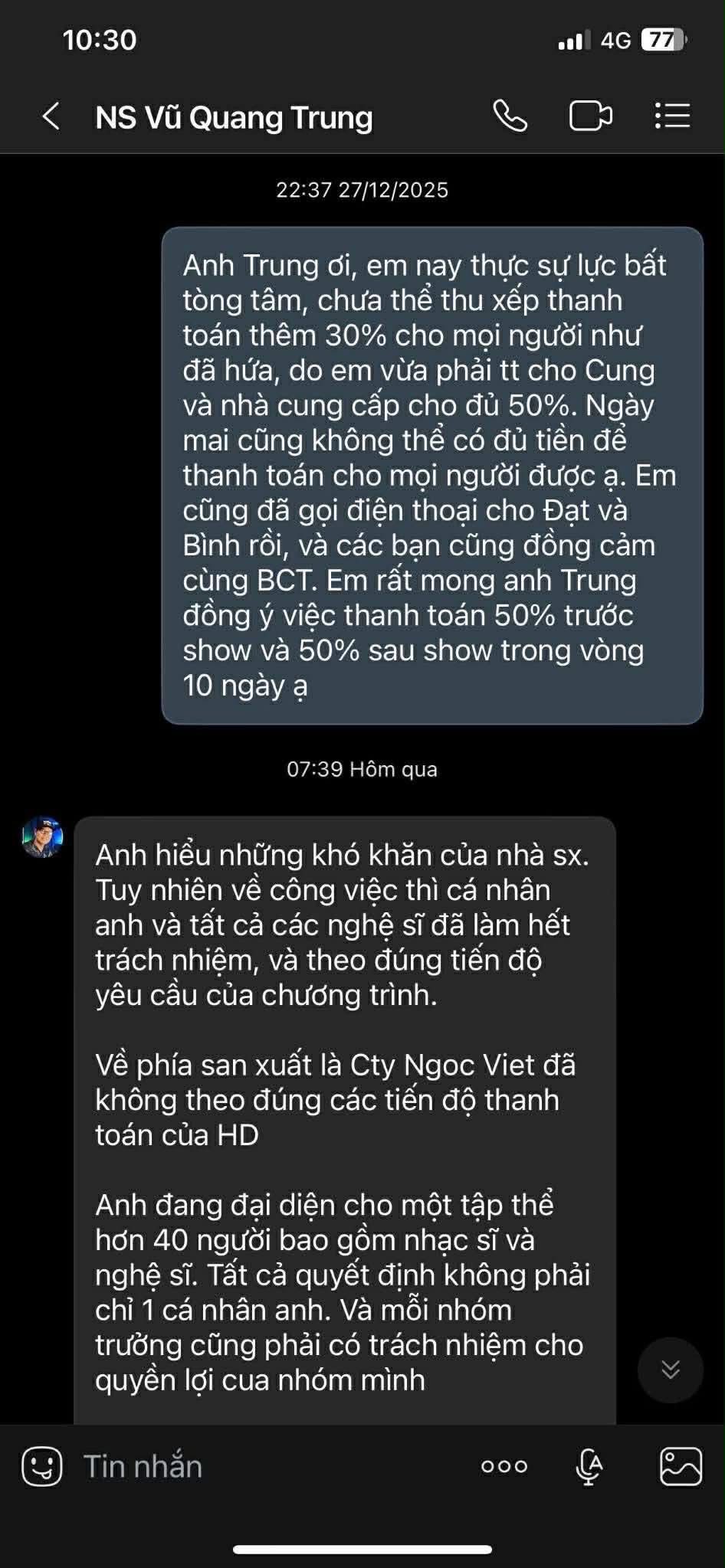 Dù chưa ký hợp đồng chính thức và chưa nhận bất kỳ khoản đặt cọc nào, ông và các cộng sự vẫn nỗ lực làm việc với tinh thần trách nhiệm. Tuy nhiên, việc nhà sản xuất không thực hiện nghĩa vụ tài chính đúng hạn khiến nhiều nghệ sĩ như phải tự chi trả toàn bộ chi phí cá nhân để phục vụ tập luyện.