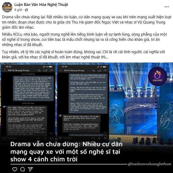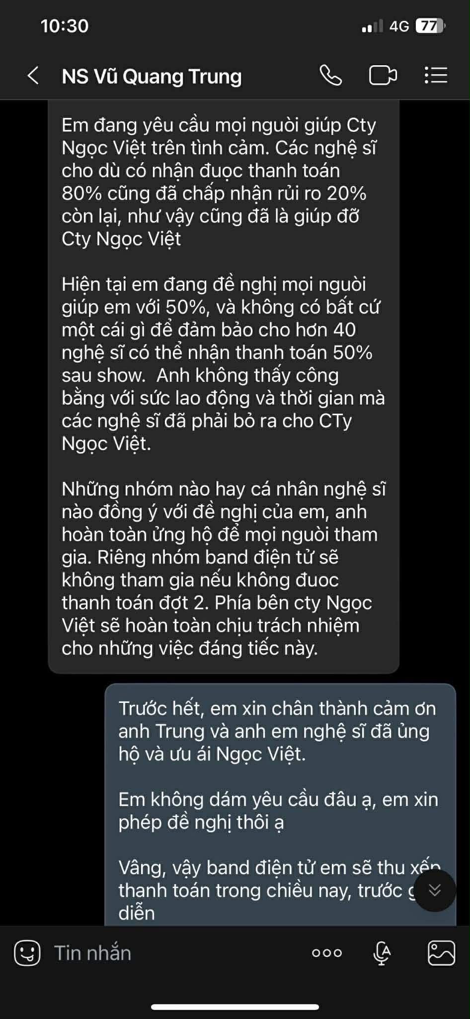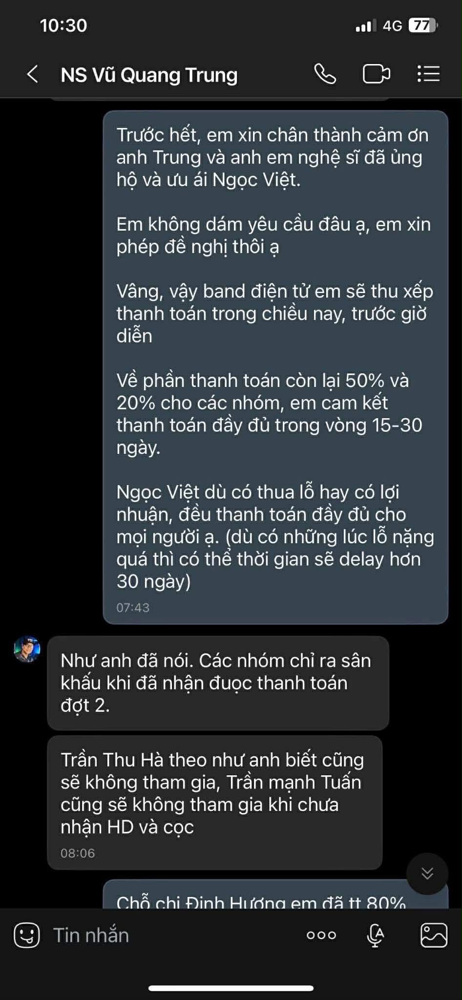 Trong khi đó, một số nghệ sĩ như Phạm Thu Hà, Vũ Thắng Lợi… cho biết trước show đã nhận 50% cát-xê theo hợp đồng.