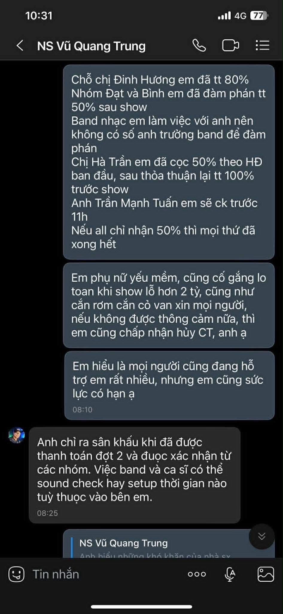 Cô tiếp tục: “Về phía các nghệ sĩ, tôi được biết không chỉ nhạc sĩ Trần Mạnh Tuấn, ca sĩ Hà Trần, Tấn Minh, mà nhiều người khác cũng ở cùng hoàn cảnh như tôi: dù có hợp đồng và những hứa hẹn ‘chắc nịch’ qua các cuộc điện thoại, nhắn tin, đến giờ phút này vẫn chưa nhận được đồng tiền nào. Kể cả chi phí cho việc di chuyển và ăn ở khách sạn cũng đều do chúng tôi tự lo. Để rồi sau khi đổ tâm huyết tập luyện, chúng tôi đành lại tự lo trở về”.