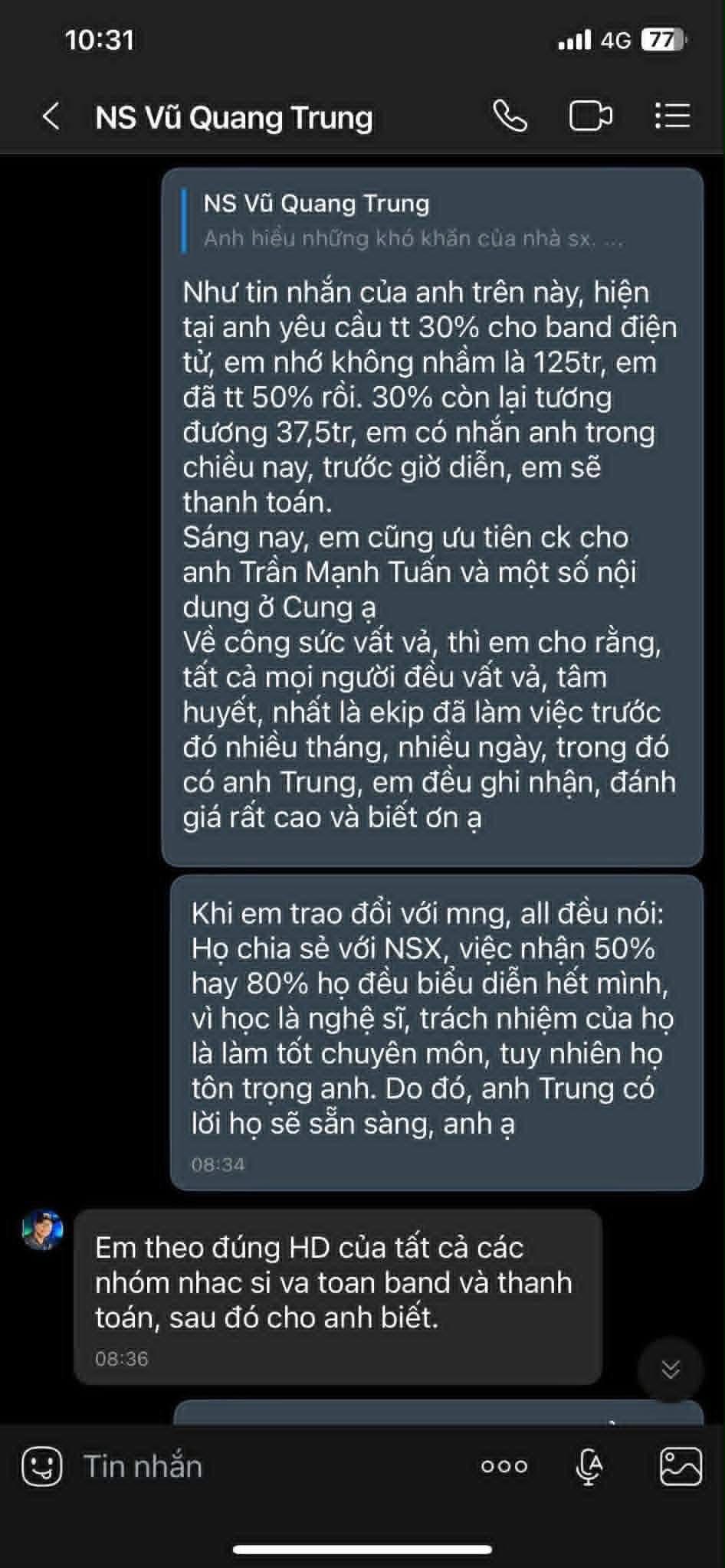 Chiều 30/12, ông Vũ Quang Trung chính thức lên tiếng, làm rõ những nguyên nhân khiến đêm nhạc không thể diễn ra. Theo ông, có 3 vấn đề then chốt: tác quyền, vi phạm hợp đồng từ phía nhà sản xuất và quỹ thời gian chuẩn bị không đủ để đảm bảo chất lượng nghệ thuật.