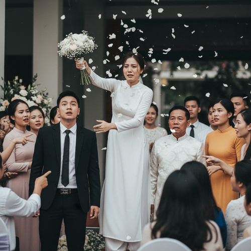 Bất ngờ, Hân quay người, không ném hoa cho ai mà thẳng tay ném mạnh bó hoa cưới xuống đất. Tiếng rơi vang lên trong sự ngỡ ngàng của quan khách. Hân ngẩng đầu, giọng bình thản nhưng đôi mắt đỏ hoe. Cô nói…