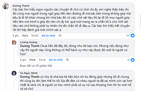 Hơn nữa trên MXH cũng xuất hiện một sô bình luận trái chiều khẳng định vì lý do một người hàng xóm trong khu ngõ đó không chịu đóng góp đường đi ngõ chung nên chị mới mang ô tô ra chắn lối đi.