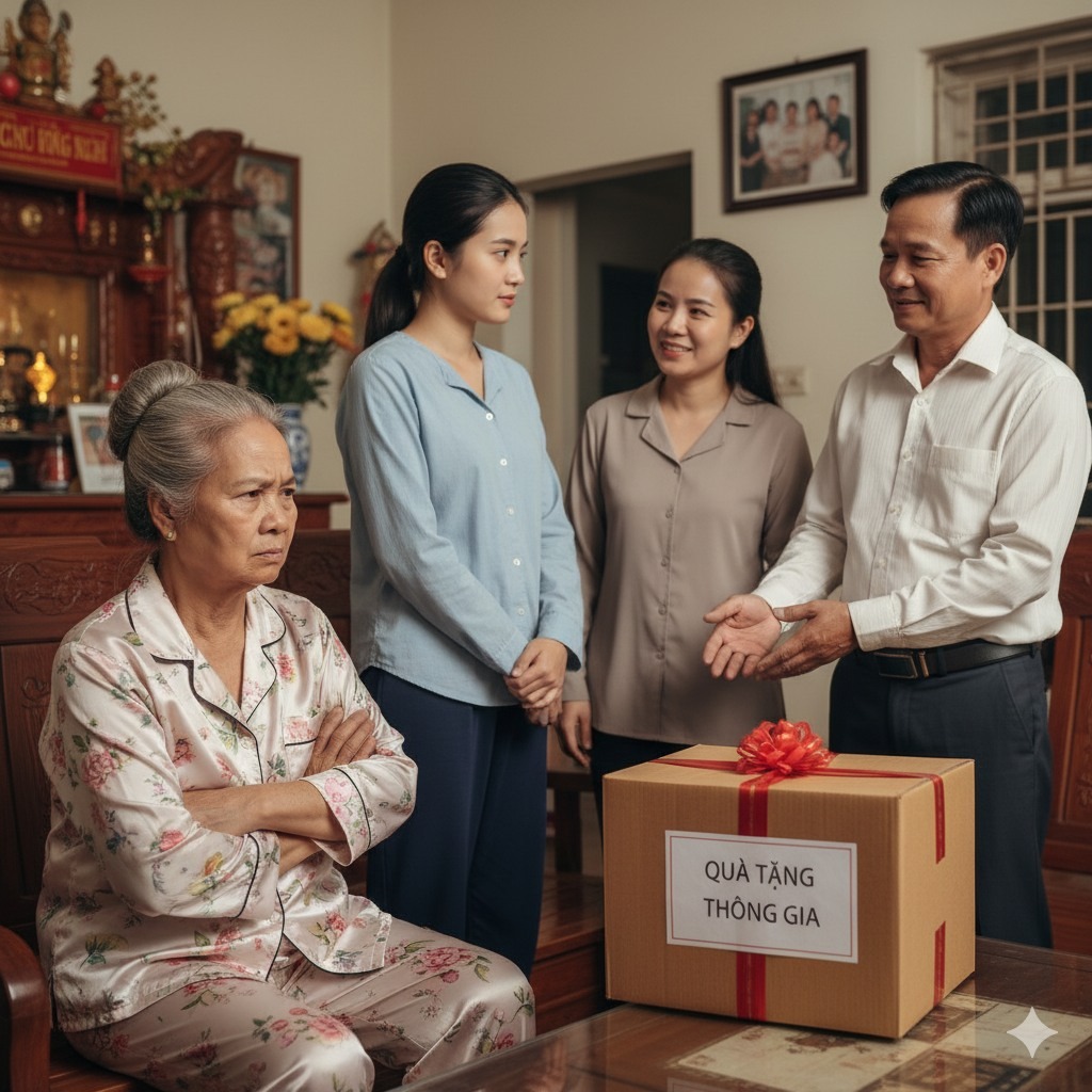 Tối hôm ấy, khi cả nhà tụ tập đông đủ, bà Tư mở quà. Chai dầu thơm khiến mọi người trầm trồ. Rồi bà cầm phong bì, nghĩ là tiền mừng. Nhưng khi xé ra, tất cả chết lặng: