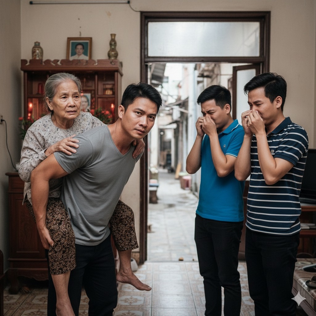 Ngày đầu, Dũng và Hòa còn lui tới thăm nom. Nhưng chỉ vài lần, cả hai đã lảng tránh. Họ viện cớ bận công việc, bận con cái. Khi y tá nhờ phụ cõng mẹ ra ngoài hong nắng, Dũng nhăn mặt: