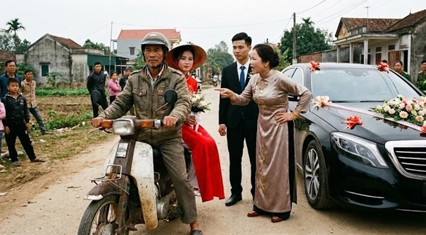 Mọi ánh mắt đổ dồn về phía cổng. Một chiếc xe máy Honda Cub đời cổ, rỉ sét loang lổ, yếm xe vỡ nát được buộc chằng chịt bằng dây thun, đang ì ạch tiến vào sân. Người lái xe là một ông già gầy gò, da đen nhẻm, mặc bộ vest cũ kỹ rộng thùng thình, chân đi đôi dép da đã sờn mũi. Phía sau xe, Mai – cô dâu xinh đẹp – đang rụt rè ngồi, tay giữ chặt tà áo dài để không bị quấn vào nan hoa xe máy.