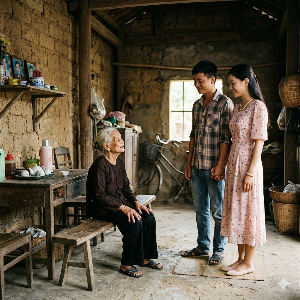 Vậy là một tuần trước hôn lễ, tôi đánh liều thử lòng em. Tôi rủ em về quê thăm mẹ — nhưng không đi xe hơi như mọi khi, mà bắt xe khách, về căn nhà cũ kỹ giữa đồng ruộng, nơi mẹ tôi vẫn sống một mình, mái nhà nghiêng ngả, tường bong tróc.