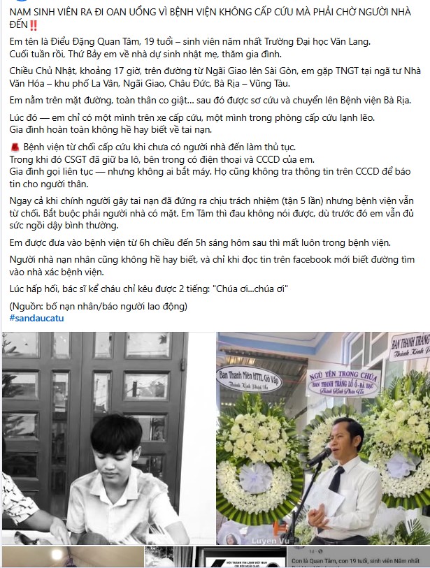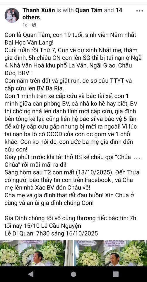Ngày 17 tháng 10 năm 2025, báo điện tử VTC đăng tải bài viết với tiêu đề “Vụ ‘nam sinh bị tai nạn không được cấp cứu kịp thời’: Bệnh viện Bà Rịa lên tiếng”. Nội dung như sau: