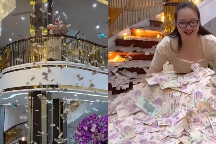 Trong đoạn clip được đăng tải, Hoàng Hường vừa đi vừa ném tiền từ trên cầu thang xuống rồi tung lên không trung. Đáng nói, dưới sàn nhà rất nhiều tờ tiền các mệnh giá cũng được rải sẵn, khi nữ đại gia này đi từ trên cầu thang xuống đã trực tiếp giẫm lên rồi tiếp tục ném tiền khắp sàn.